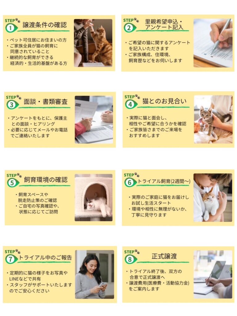 MIRAI CAT BASEでは、猫たちが安心して新しい家族のもとへ巣立っていけるように、譲渡費用や仕組みを分かりやすくご案内しています。